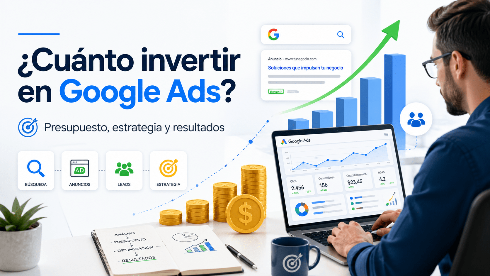 Aquí entra en juego toda la estrategia de marketing digital. Importa el presupuesto, sí, pero también importan la selección de palabras clave, la calidad de los anuncios, la intención de búsqueda, la página de destino y la medición de conversiones.